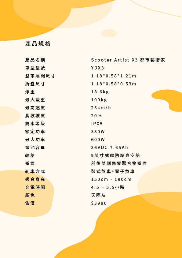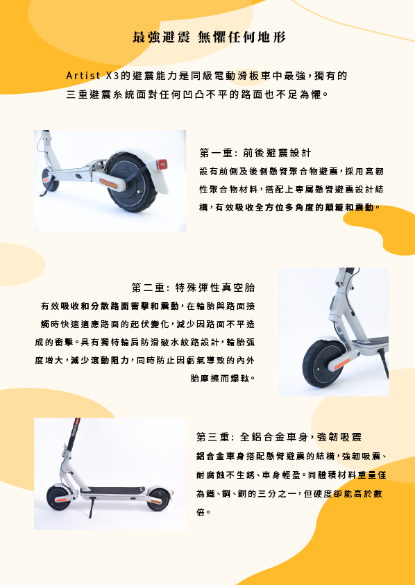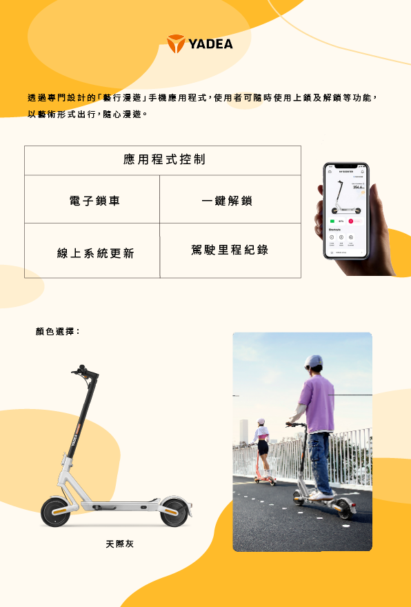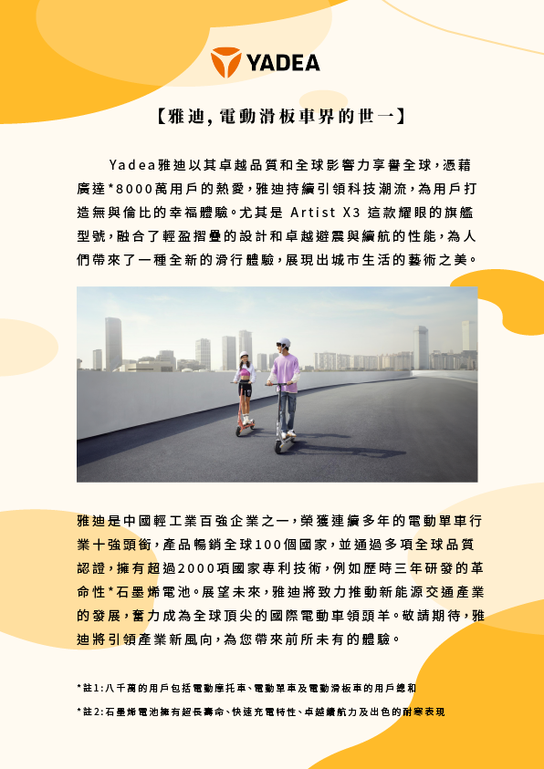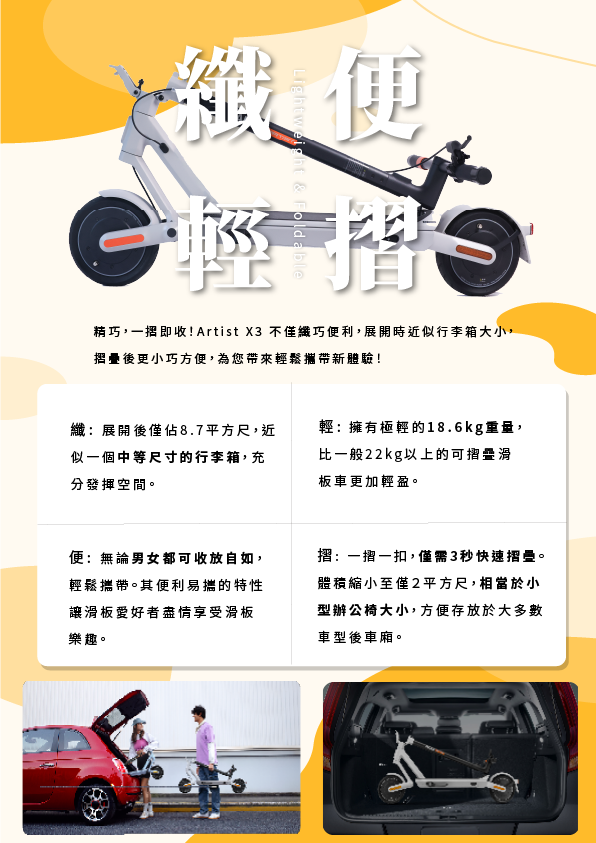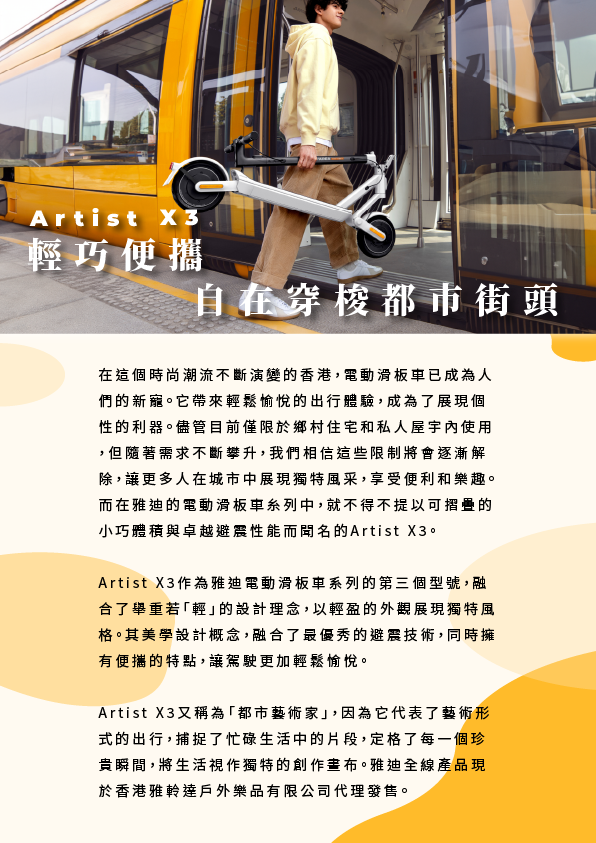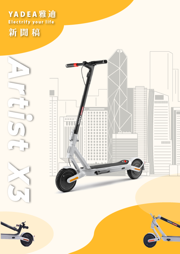 Artist X3作為雅迪電動滑板車系列的第三個型號,融合了舉重若「輕」的設計理念,以輕盈的外觀展現獨特風格。其美學設計概念,融合了最優秀的避震技術,同時擁有便攜的特點,讓滑行更加輕鬆愉悅。Artist X3又稱為「都市藝術家」,因為它代表了藝術形式的出行,捕捉了忙碌生活中的片段,定格了每一個珍貴瞬間,將生活視作獨特的創作畫布。