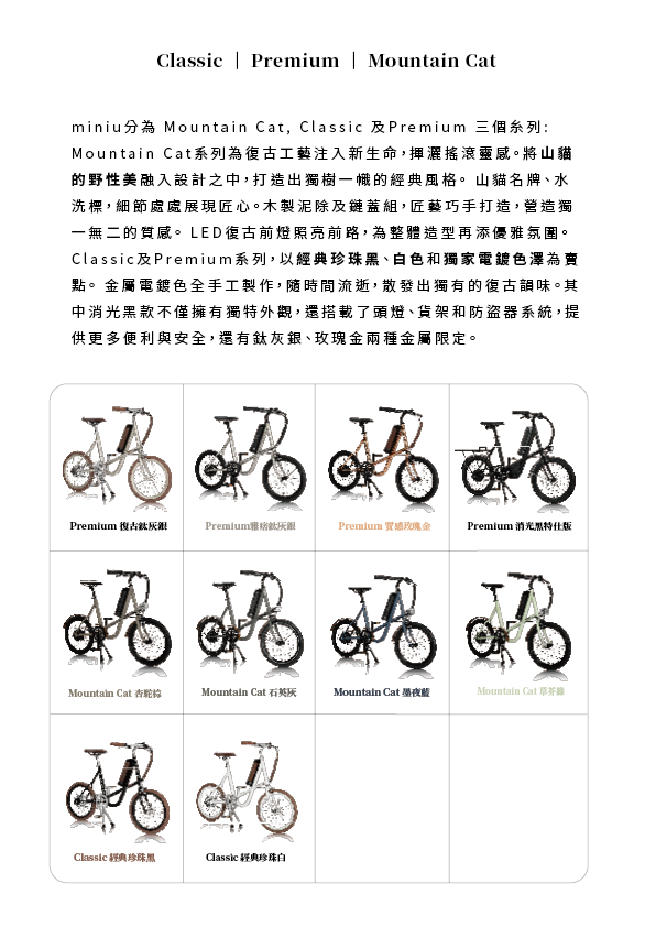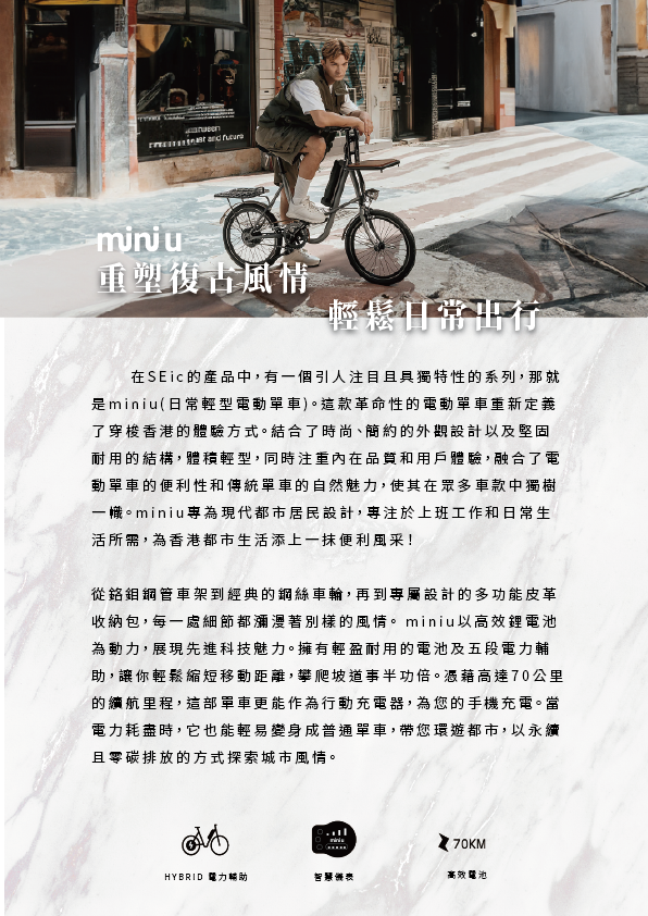 重新定義穿梭香港的體驗方式。結合了時尚、簡約的外觀設計以及堅固耐用的結構,體積輕型,同時注重內在品質和用戶體驗,融合了電動單車的便利性和傳統單車的自然魅力,使其在眾多車款中獨樹一幟。miniu 專為現代都市居民設計,專注於上班工作和日常生活所需,為香港都市生活添上一抹便利風采。